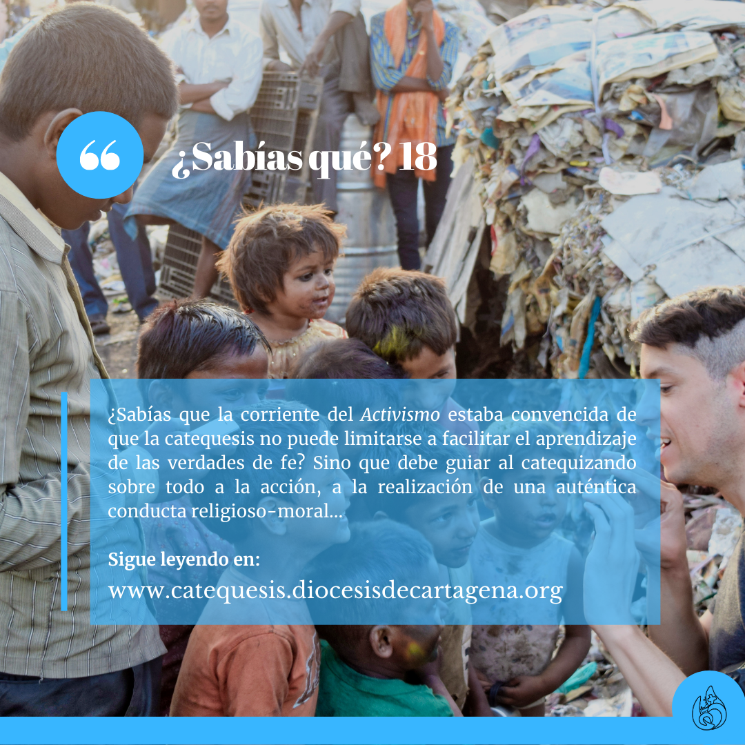 ¿Sabías que la corriente del Activismo estaba convencida de que la catequesis no puede limitarse a facilitar el aprendizaje de las verdades de fe? Sino que debe guiar al catequizando sobre todo a la acción, a la realización de una auténtica conducta religioso-moral. Así, los catequizandos asumen un papel activo durante el encuentro catequístico, pues trabajan (diseñan, pintan, buscan pasajes e historias bíblicas, las reproducen escénicamente, discuten, recogen en carpetas el material trabajado…). Se reclama la experiencia (religiosa), como sinónimo de vida (religiosa): el catequizando debe experimentar la fe y vivirla integralmente, con la mente y el corazón.